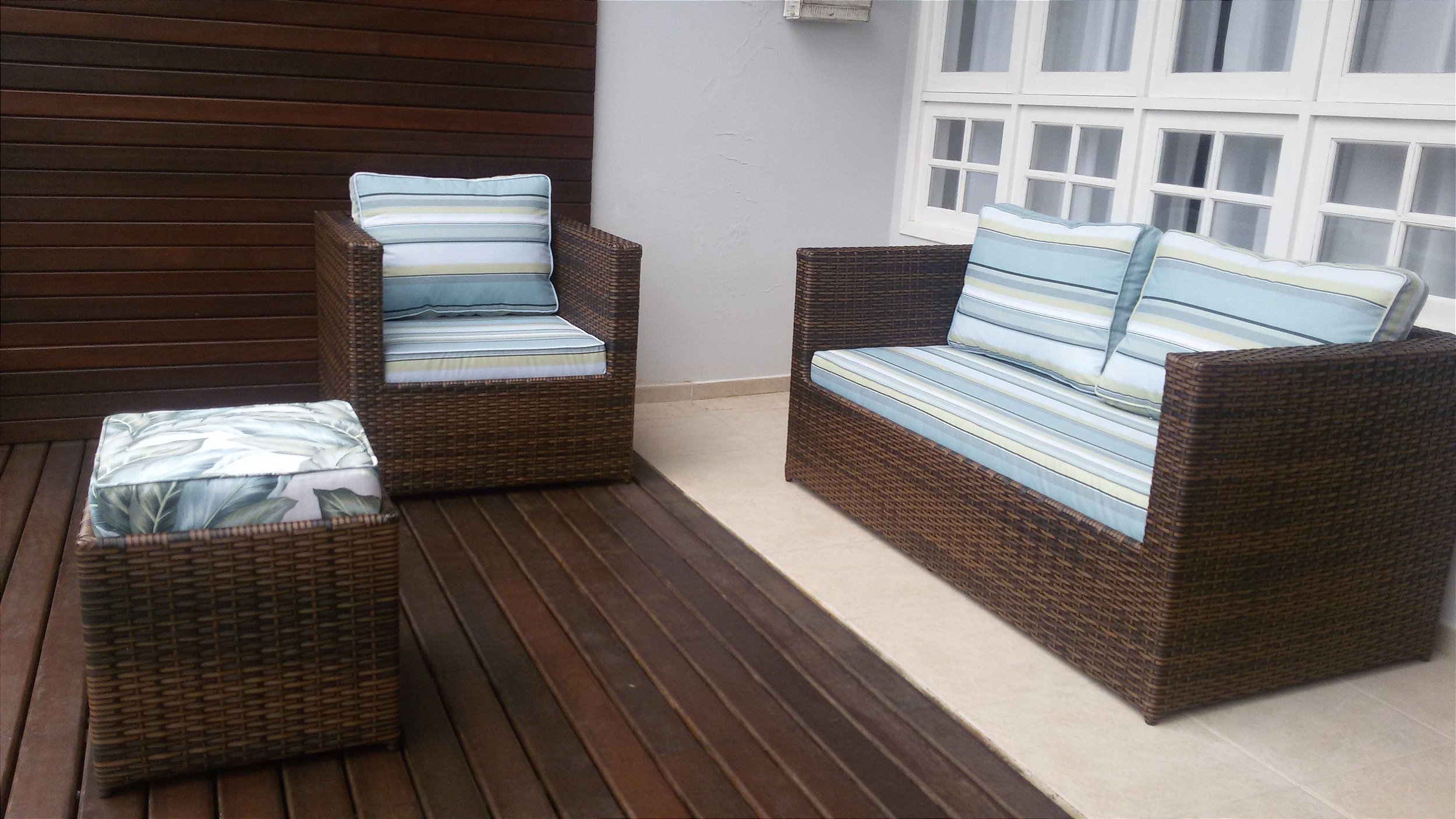 ( Estrutura em alumínio, revestido com fibra sintética, madeira naval, tecido acqua block)